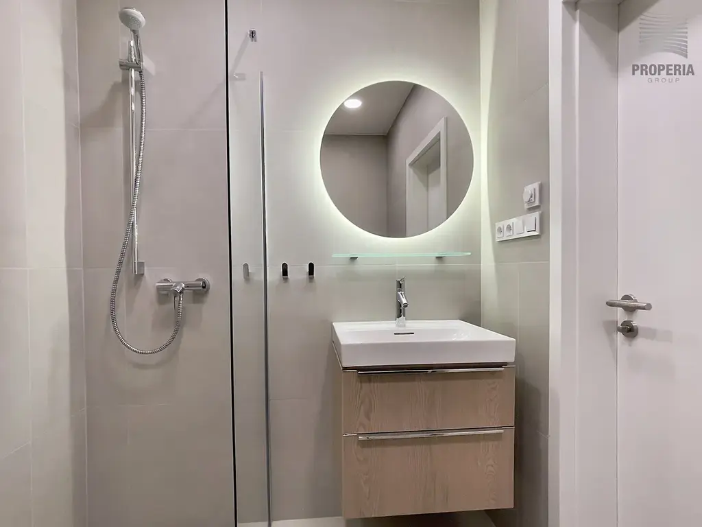 Interiér byl navržen s důrazem na kvalitu, funkčnost a čistý moderní styl. Součástí pronájmu je kompletní vybavení, které výrazně zvyšuje komfort každodenního bydlení. Kuchyňská linka se spotřebiči (trouba, elektrická varná deska, digestoř, myčka, lednice, kávovar, rychlovarná konvice) i vybavením (nádobí a příbory). Dále pračka se sušičkou, nechybí ani televize, připojení k internetu, postel a prostorné vestavěné skříně na chodbě i v ložnici. Samozřejmostí jsou okenní rolety.