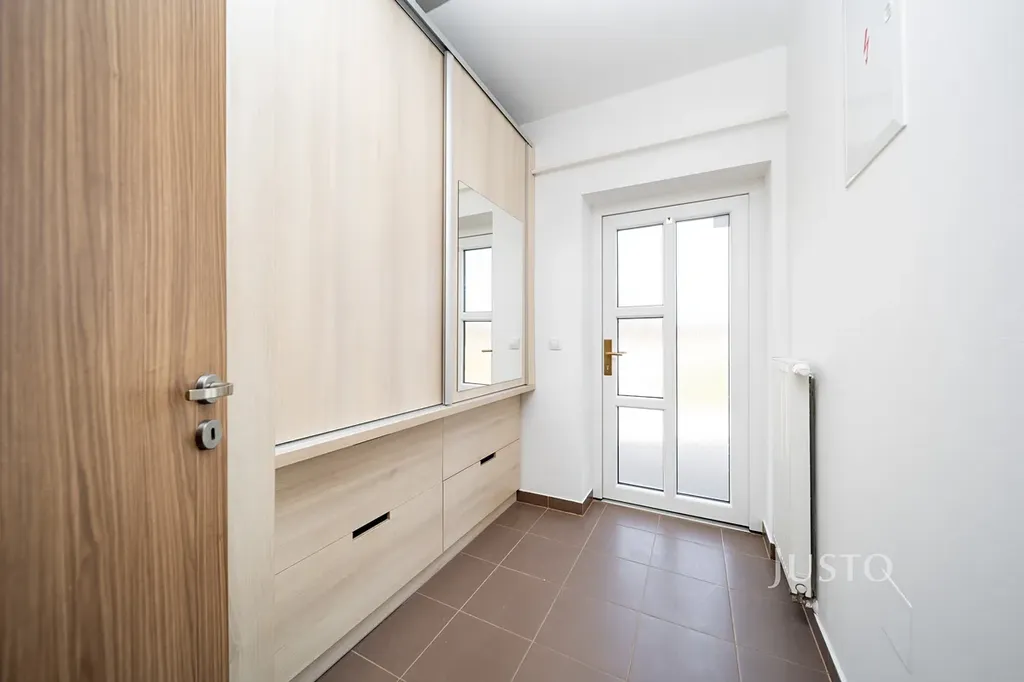 Velkým benefitem je přístup na zahradu – pohodlně pěšky, ale také skrze kryté parkovací stání s možností vjezdu autem přímo na pozemek. Na zahradě se nachází také zahradní domek, ideální pro umístění zahradního nářadí a sekačky.