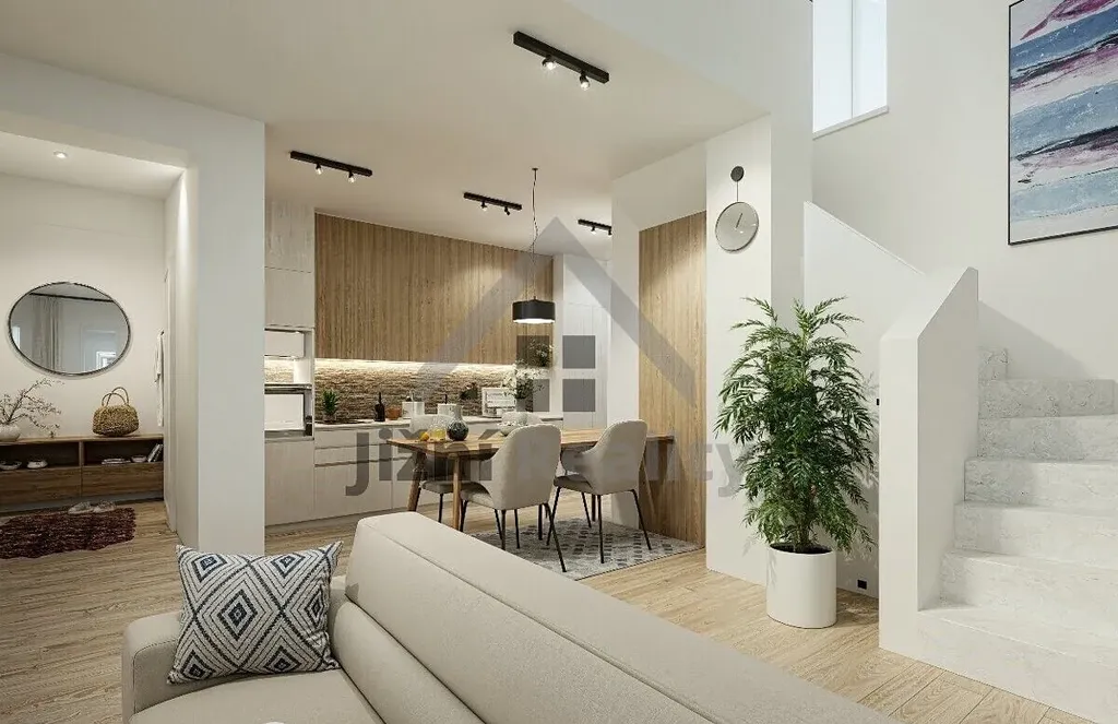 Nabízíme Vám k prodeji zcela nový byt v nově vystaveném domě o velikosti 95 m2 a dispozici 4+KK. Mometnálně si lze v domě vybrat ze tří bytů. Ve spodním patře se nachází byt 3+KK a mezonet o velikosti 4+KK. Ve druhém patře je podkrovní byt o velikosti 4+KK. Všechny byty jsou dělané z kvalitních materiálů. V inzerci je použita vizualizace jak bytové jednotky budou vypadat po zabydlení. Nový majitel si může vybavit bytovou jednotku dle vlastních představ včetně kuchyně, která není součástí prodeje. Byty jsou vytápěné tepelným čerpadlem, dům je zcela zrekonstruovaný a zateplený. Provozní náklady na bydlení jsou velice nízké. Do domu není třeba dlouhou dobu investovat. Ke každému bytu náleží sklep. Základní občanská vybavenost je v obci, zbytek v nedalekých Prachaticích. Městys dub u Prachatic leží v krásné přírodě a nabízí poklidné bydlení venkovského charakteru. Doporučuji prohlídku.