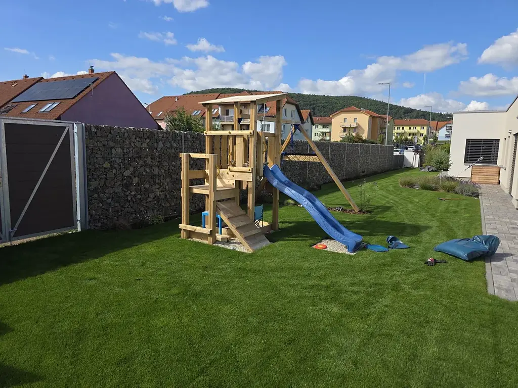 Zahrada o výměře 565 m² je bez dalších staveb, osázena travou, okrasnými keři a dřevinami, zakrslými stromky a sezónními květinami, je zde přívod elektřiny pro budoucí pergolu a zahradní domek. Na zahradě je vybudovaný zavlažovací systém, dětské pískoviště a průlezka.