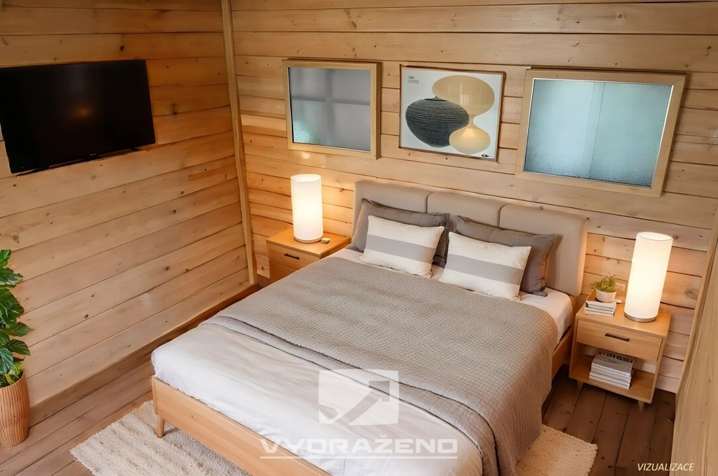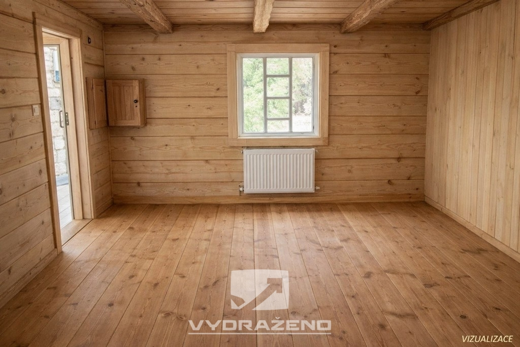 V přízemí najdeme obývací pokoj s kuchyní cca 15 m2, ložnici asi 7 m2 a také předsíň o výměře 6 m2. Pro možnou budoucí koupelnu se zde nachází místo o velikosti 4 m2. Pod předsíní se nachází sklad o velikosti 6 m2, který výborně poslouží jako spíž či další úložný prostor. V 1.NP se rozkládá půdní prostor, který nabízí celkovou výměru 22 m2.