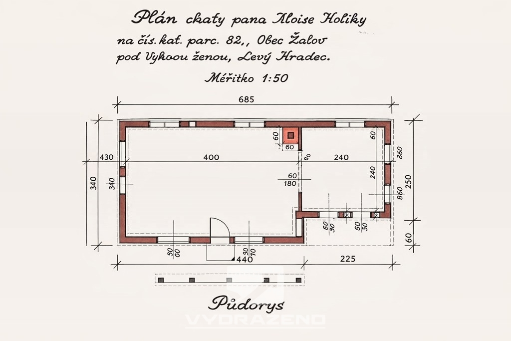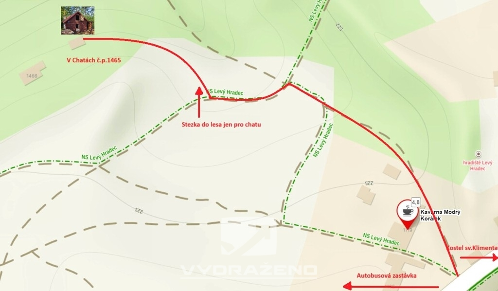 Jako na spoustě jiných míst, i zde stojí chata na pronajatém lesním pozemku od města Roztoky o velikosti 22 m2 a pozemek okolo chaty 243 m2. Nachází se v lokalitě Levý Hradec asi 300 m od kavárny Modrý Korálek, kde lze i parkovat a turistickou cestou dojít až k samotné chatě. Celkové náklady za rok činí 1.800 Kč za pronájem pozemků a vývoz popelnice 750 Kč/rok.