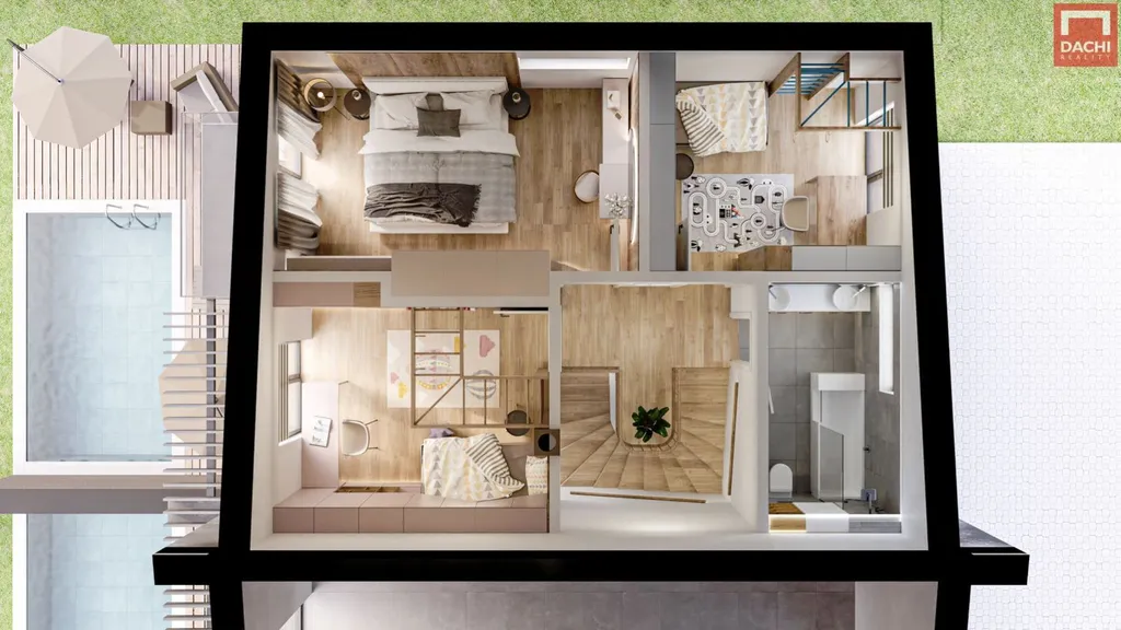 Součástí jednotky je vlastní pozemek o výměře 353 m se zahradou, která poskytuje dostatečný prostor pro relaxaci, rodinné aktivity i případné úpravy dle vašich představ. Dispoziční řešení je navrženo s důrazem na praktičnost. V přízemí se nachází otevřený obývací pokoj s kuchyňským koutem a přímým vstupem na terasu a zahradu, dále předsíň, šatna a samostatné WC. V patře je umístěna klidová zóna se třemi samostatnými pokoji, koupelnou a balkonem. Jednotka má vlastní vstup a samozřejmostí jsou parkovací stání přímo u domu.