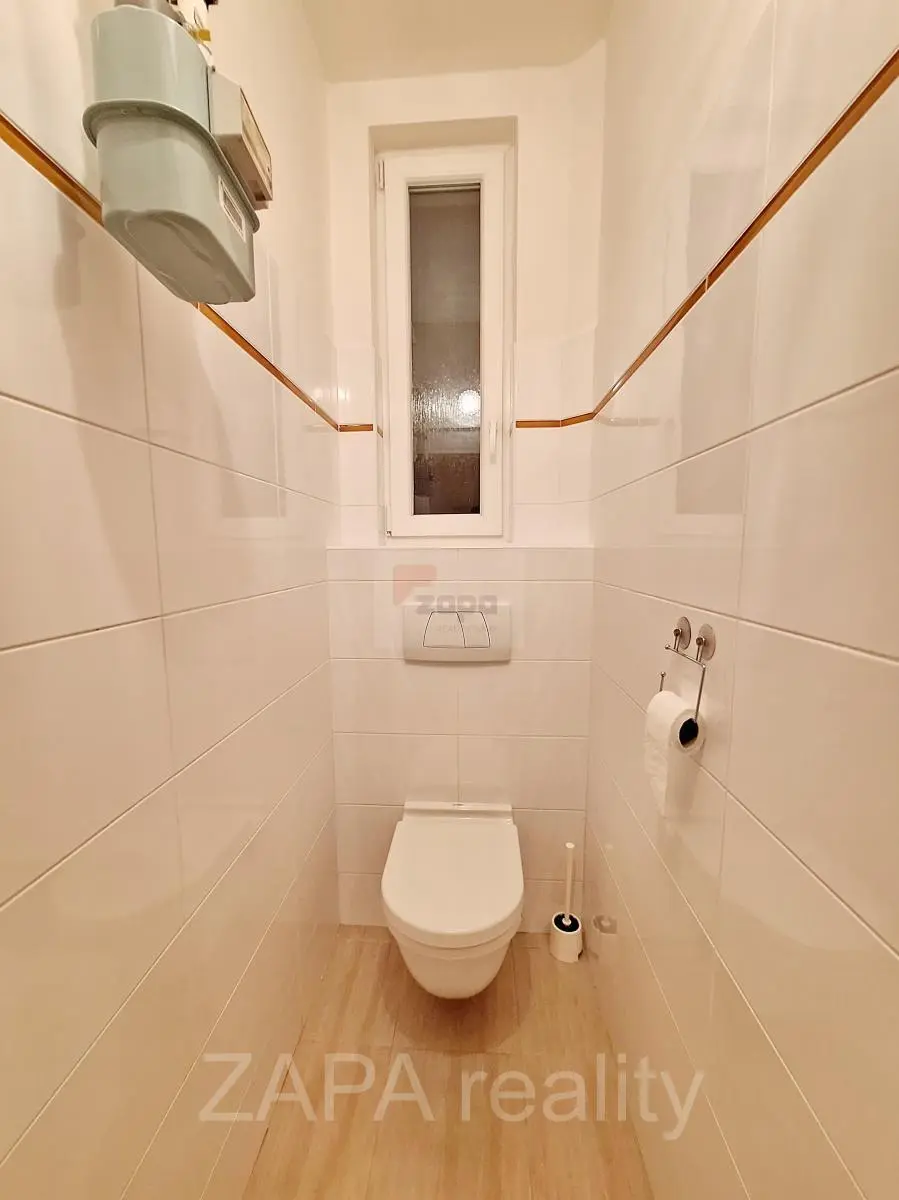 Obývací pokoj je průchozí do ložnice (s okny do klidné ulice), kuchyň je samostatná neprůchozí s komorou (s okny do vnitrobloku), prostorná koupelna se vstupem z předsíně je se sprchovým koutem (kde je možné umístit pračku a sušičku), WC je samostatné a oddělené (vše viz plánek bytu). Topení je ústřední- vlastní plynový kotel (nový).