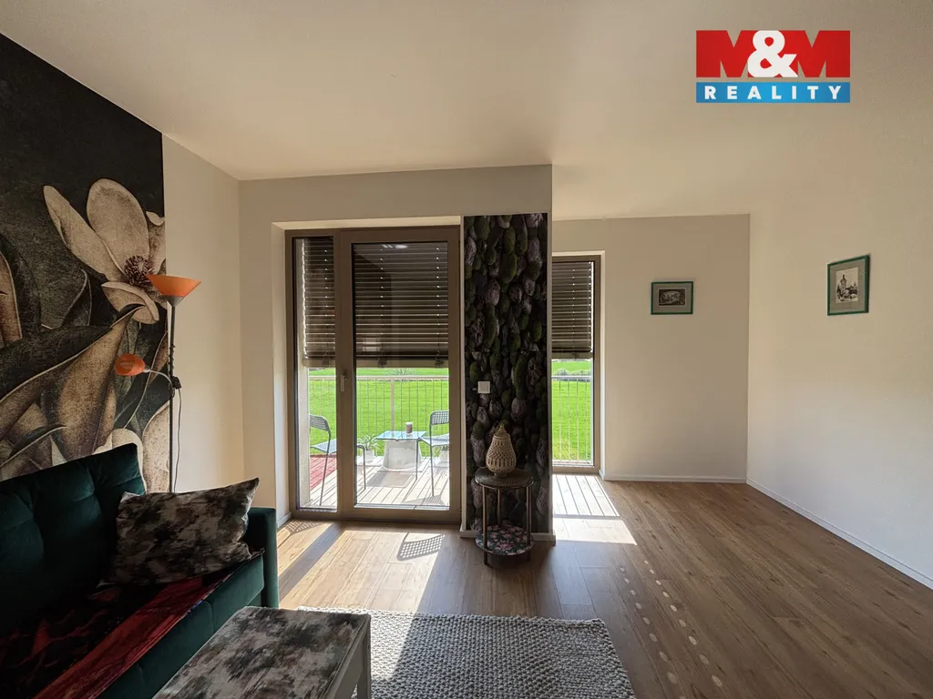 Moderní interiér: otevřený obytný prostor s kuchyňskou linkou, kvalitní podlahy, velká okna se žaluziemi, balkon s posezením, gauč, TV a skříň, keramický obklad a doplňky od značek Villeroy & Boch a Hansgrohe Vernis Blend.