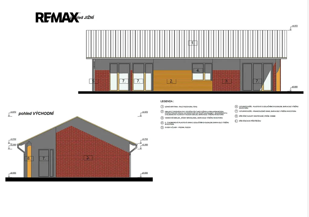 Kombinace cihlového páskového obkladu, tvrdého PVC s fólií, omítky a dřeva.