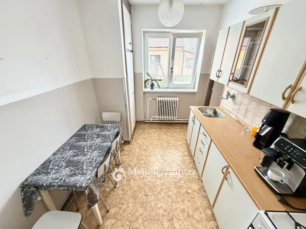 Další místností je kuchyň za kterou najdeme koupelnu s vanou, umyvadlem a přípojkou na pračku.