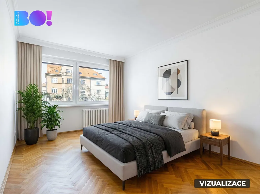 Dominantou tohoto bytu je obývák s pracovnou, na které navazuje zasklená lodžie s panoramatickým výhledem na meandr řeky Vltavy a většinu města Prahy, která nabízí skvělé místo pro odpočinek při ranní kávě nebo večerním relaxu. Všechny pokoje jsou vybaveny parketami, které bytu dodávají punc kvality a doplňují atmosféru stylové nemovitosti.