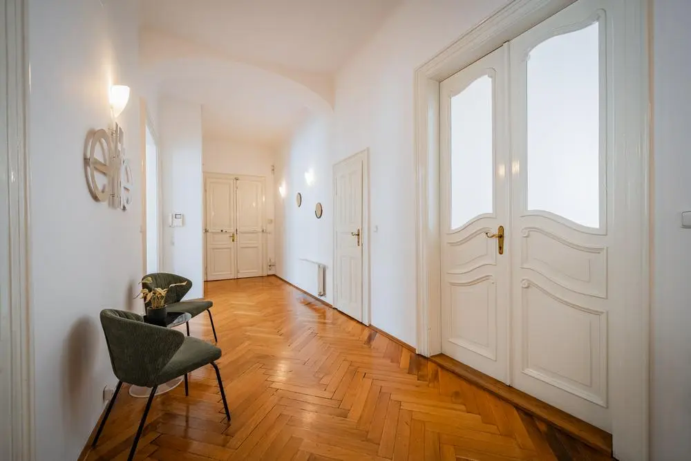 Byt je situován ve 3.patře renovovaného secesního domu s výtahem. Celková plocha činí 197 m2 a sestává ze vstupní haly, 5t- místností, kuchyně, 2x koupelnou, 3x WC. Kuchyně je vybavena kuch. linkou se zabudovanými spotřebiči, Vytápění je samostatným plynovým kotlem. V bytě jsou masivní parkety, zdobené štukové stropy, dvoukřídlé dveře.