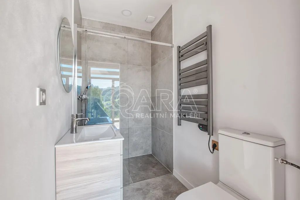 Objekt je osazen kvalitními hliníkovými okny s trojskly a speciální barevnou úpravou. Tato okna zajišťují vynikající tepelné i zvukové izolační vlastnosti a úsporu energií. Prostory podtrhují moderní podlahové krytiny vinylová podlaha a dlažba, které jsou nejen elegantní, ale také velmi praktické a snadné na údržbu. O stálé a příjemné teplo se postará chytré podlahové vytápění, které si pohodlně nastavíte pomocí termostatu. Odpadní vody jsou řešeny vlastní jímkou, a k dlouhé životnosti a efektivitě přispívá i plechová střecha se stříkanou izolací.