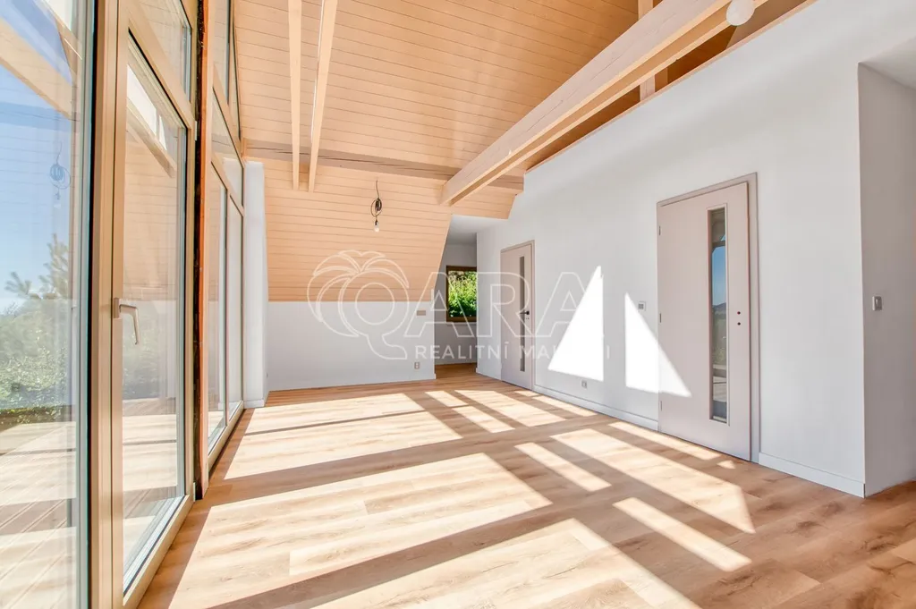 Dominantou je velkoformátové prosklení, které se táhne od podlahy až ke stropu a otevírá fascinující výhledy do okolní krajiny. Tento jedinečný architektonický prvek nejenže zaplaví interiér přirozeným světlem, ale zároveň vám poskytne přímý vstup na terasu, která se stane dokonalým místem pro odpočinek a pozorování přírody. Celkový design dokonale vybízí k vybavení v skandinávském stylu, který pracuje se světlými barvami a přírodními materiály.