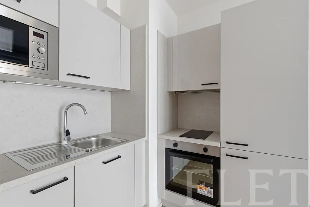 Interiér nabízí efektivně využitý prostor s obývací částí a plně vybaveným kuchyňským koutem. Ten disponuje vestavnými spotřebiči – varnou deskou, troubou, digestoří, mikrovlnnou troubou i lednicí s mrazákem, nechybí ani vestavná pračka. V koupelně je sprchový kout, toaleta a elektrické odvětrávání. Praktická předsíň se skříní poskytuje dostatek úložného prostoru. Velkým benefitem je také balkon o velikosti 3 m², ideální pro ranní kávu či večerní relax.