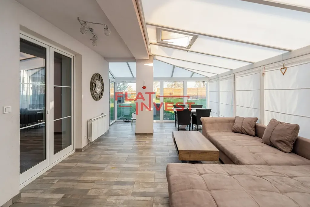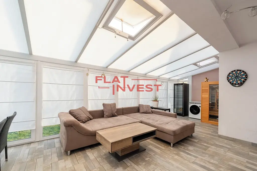 Z obývacího pokoje vstoupíte do velkorysé zimní zahrady (29 m²) s infra saunou, která je ideálním místem pro relaxaci po celý rok.