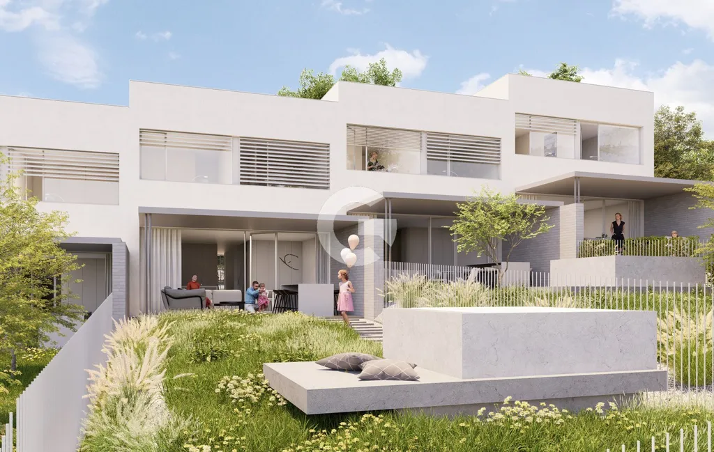 Domy nabízejí 140 m² užitné plochy s dispozicí 5+kk — dostatek místa pro rodinu s dětmi i práci z domova. Součástí každého domu je vlastní soukromá zahrada. Vnitřní domy mají pozemek 229 m², krajní domy pak 363–374 m².