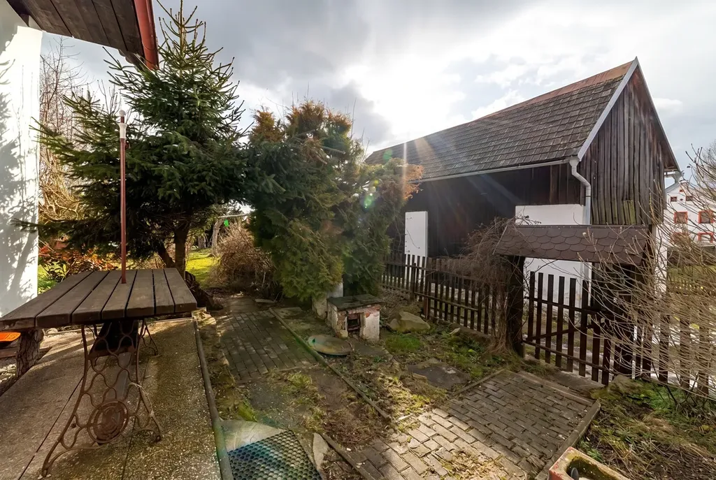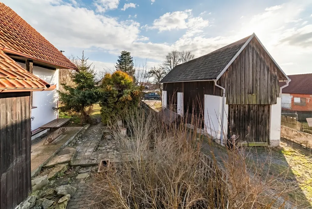Budova na pozemku o celkové rozloze 689 m2 napojeným na obecní cestu díky které lze zastavit přímo u domu. Dispozice domu je 4+1 o celkové podlahové ploše 125 m2 s možností využití půdního prostoru. Součástí domu je i malý sklípek s možností přístupu z budovy nebo zvenčí. Na pozemku se dále nachází venkovní posezení, dětské pískoviště a improvizovaně zastřešený bazén. Předmětem prodeje je i 60 m2 stodola stojící na dalším pozemku o rozloze 143 m2, která lze využít jako dvougaráž s přímým vjezdem z příjezdové cesty.