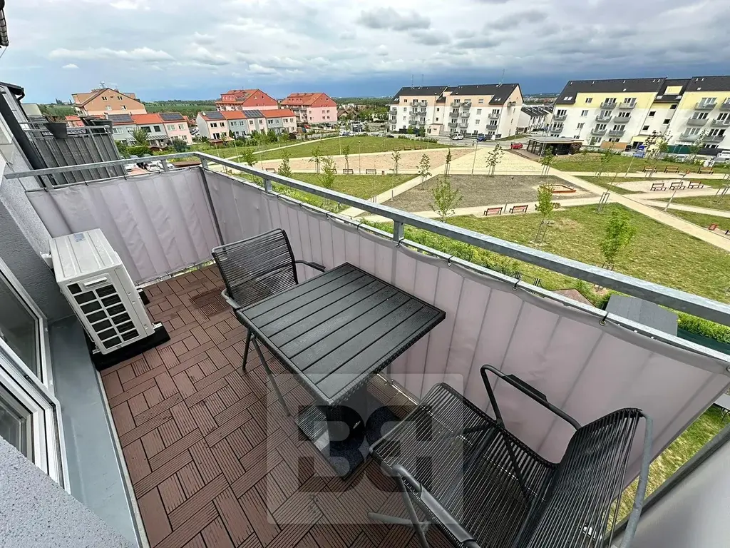 Byt disponuje balkónem o ploše 4 m2, vč. 2 židlí a stolu, s výhledem na park a sklepem o velikosti 2 m2 s policemi.