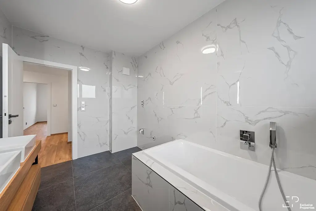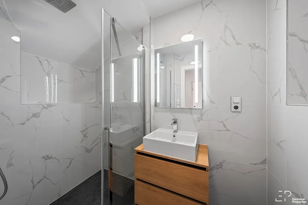 V patře jsou umístěny tři ložnice, z toho hlavní ložnice má vlastní koupelnu se sprchou. K dispozici je také druhá koupelna s vanou, WC, 2 umyvadla. Celkem tedy 3 koupelny.