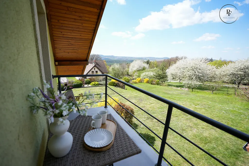 V horním podlaží se nachází klidová část domu se třemi ložnicemi, koupelnou a balkonem, ze kterého se otevírá krásný výhled do okolní krajiny. Právě pohled do zeleně a na hrad Bezděz jen podtrhuje výjimečnost této nemovitosti a dodává celému místu jedinečný charakter.