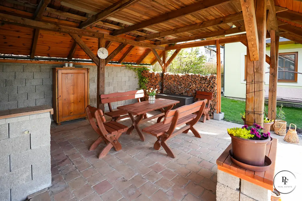 Součástí nemovitosti je také upravená zahrada, která působí otevřeně a vzdušně a zároveň poskytuje dostatek soukromí. Nechybí kryté venkovní posezení ideální pro letní večery s rodinou a přáteli, garáž ani pohodlné parkování na pozemku.