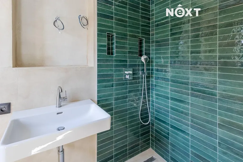 Koupelny jsou provedeny v designových omyvatelných stěrkách v kombinaci s obkladem.
