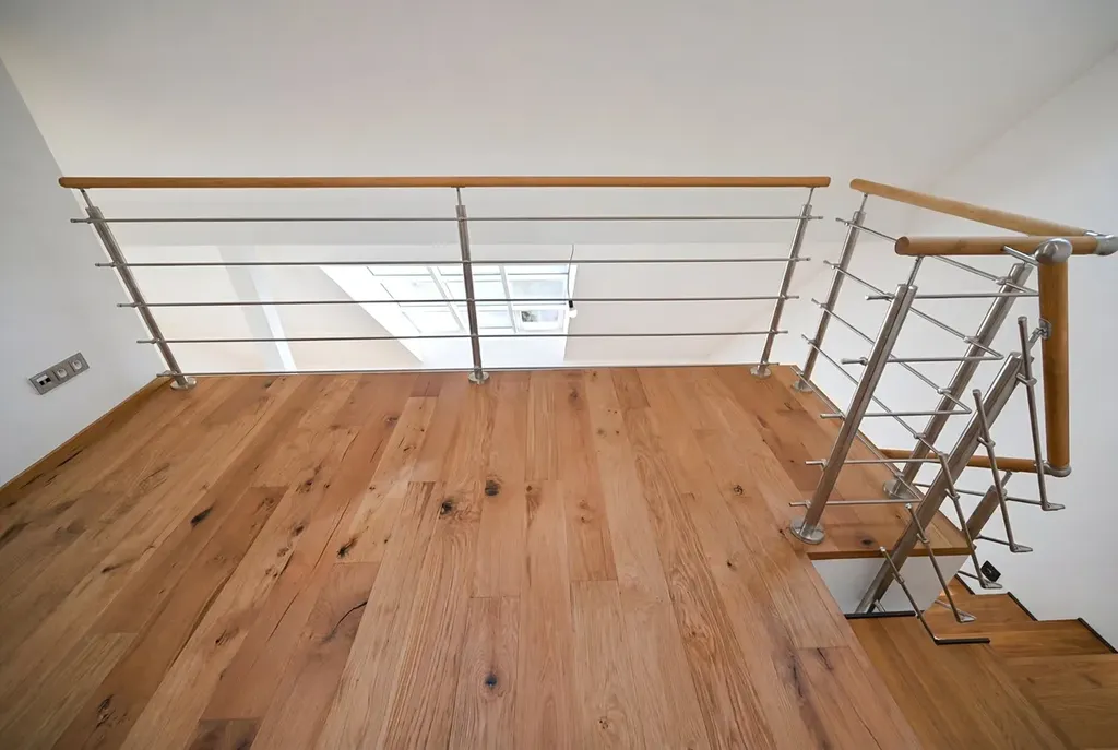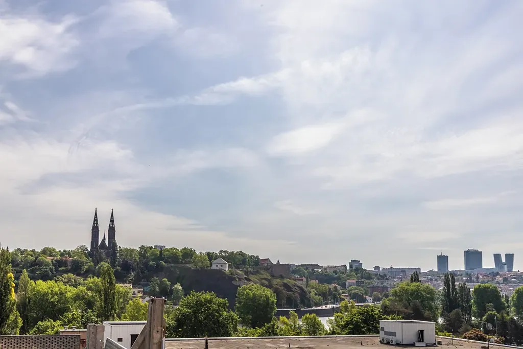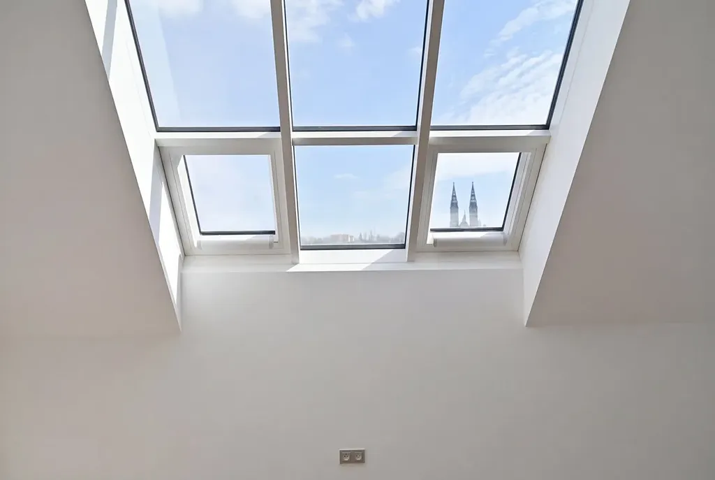 Díky velkým ateliérovým oknům je interiér krásně prosvětlený a nabízí nádherné panoramatické výhledy na Prahu. Tyto prvky podtrhují otevřenost a jedinečný charakter celého prostoru.