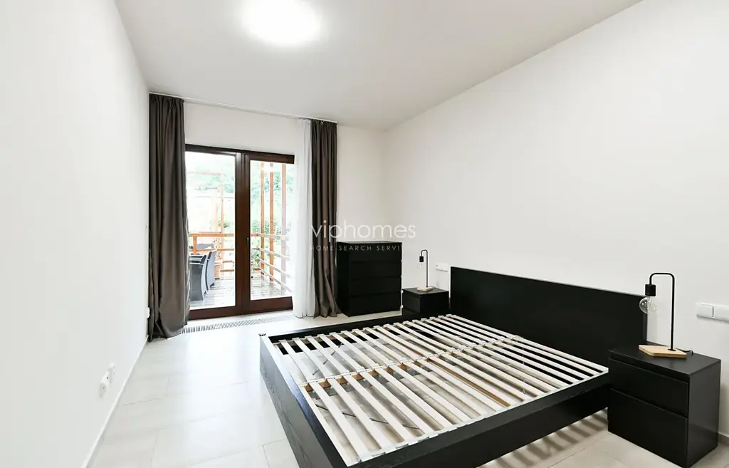 V bytě je vstupní galerie, 1 ložnice, koupelna, a společná místnost s obývacím pokojem, kuchyní a jídelnou. Z obývacího pokoje jsou francouzské dveře se vstupem na zahrádku. Výměra – celkem má byt 47 m2. 1 garážové stání 2000 Kč / měsíc, internet 400 Kč, energie dle vlastní spotřeby, kauce 2 měsíční nájemné.