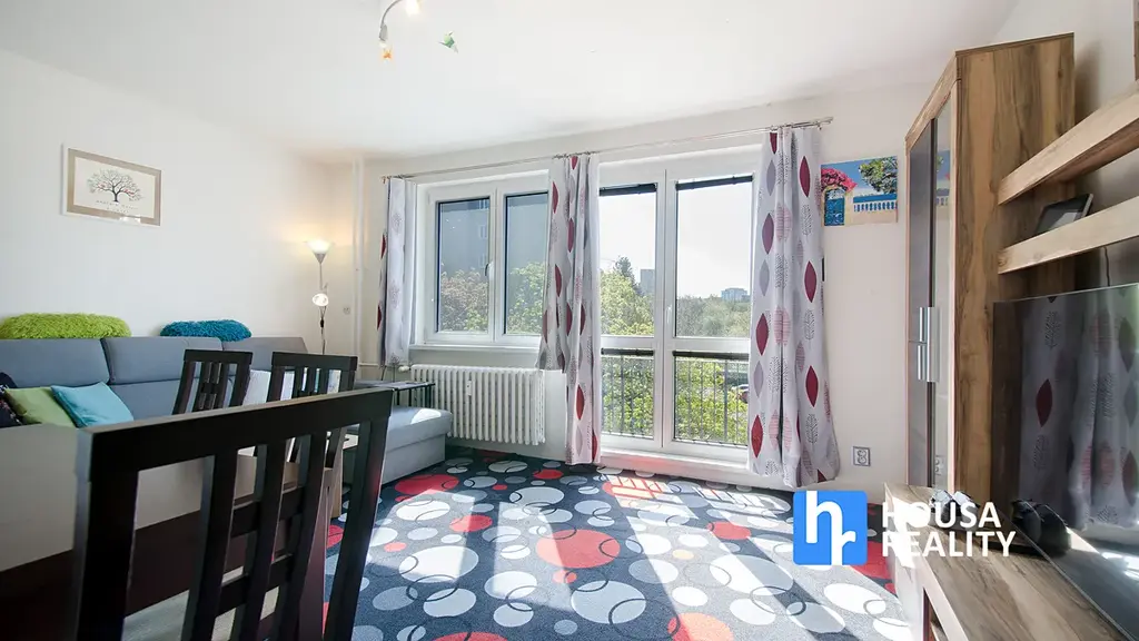 Dominantou bytu je obývací pokoj s velkou prosklenou plochou a francouzským oknem, které prostor příjemně prosvětluje. Kuchyňský kout je částečně oddělený, má vlastní okno s orientací na západ a nabízí výhled na panorama Prahy.