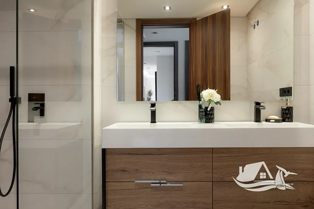 Interiér je navržen tak, aby byl elegantní, ale zároveň plně funkční. Otevřený obývací prostor s kuchyní vytváří vzdušné prostředí plné světla a plynule navazuje na venkovní část. Kuchyň s poloostrovem je plně vybavena moderními spotřebiči a doplněna detaily, které dávají smysl v každodenním životě. Vestavěné skříně, porcelánové podlahy a interiérové prvky v dekoru ořechu dodávají prostoru teplo a nadčasový charakter.