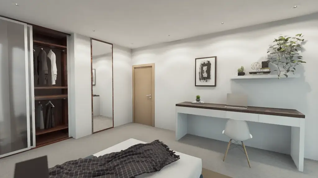 Byt je velmi prakticky dispozičně řešen, žádný z pokojů není průchozí. V ložnici je šatna, velká koupelna s vanou i sprch. koutem. Balkon je přístupný z obývacího pokoje. Byt je situován na jihozápadní stranu, aby měl dostatek světla a slunce.