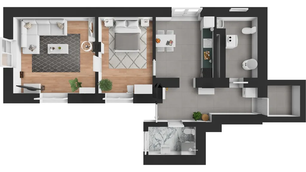 V přízemí domu se nachází prostorné 2+1 cca 70 m2. Z chodby se dostanete do kuchyně, kde jsou připravené rozvody na novou kuchyň a vstup na terasu, kde je plně vybavená letní kuchyň ( lednice, dřez, gril ) se zastřešenou terasou připravená k relaxaci. Dále je zde ložnice a pokoj, který lze využít například jako dětský nebo pracovní, koupelna s toaletou, technická místnost a sklep.