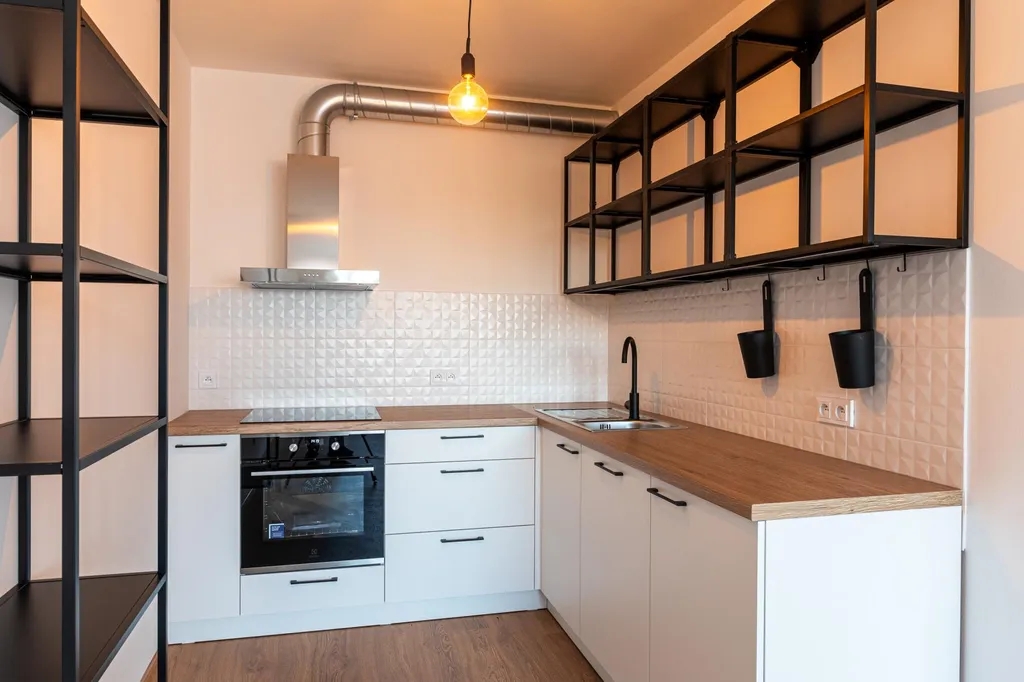 Bytová jednotka je navržena funkčně a uspořádaně , je zařízená kuchyňskou linkou s indukční deskou, el.troubou, digestoří, myčkou, lednice s mrazákem