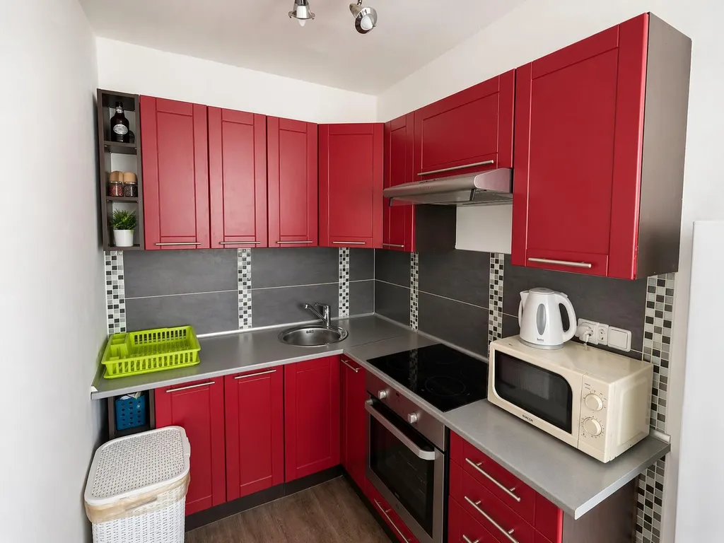 V kuchyni je kuchyňská linka s vestavěnými elektrickými kamny a indukční deskou s digestoří. V koupelně je sprchový kout, umyvadlová skříňka se zrcadlem a WC. Místnosti jsou světlé a prostorné. Fotografie upraveny bez osobních věcí nájemníka.
