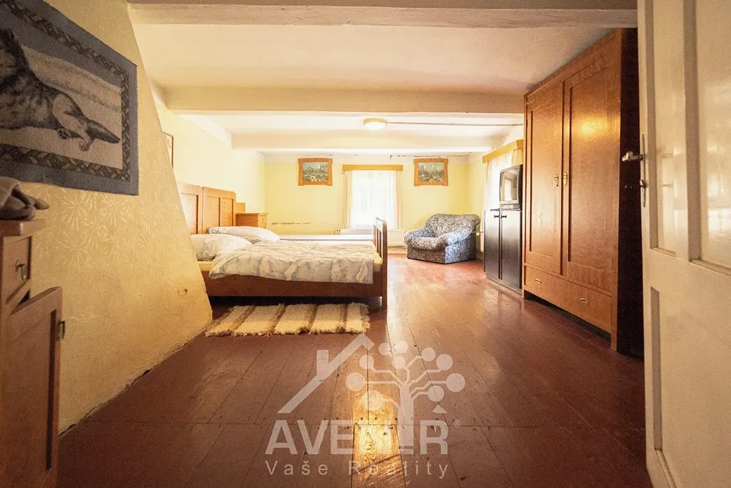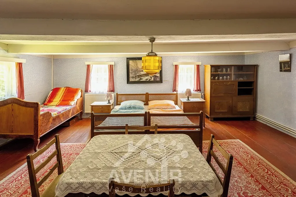 Energie: dálkový vodovod, kanalizace, kotel na dřevo, kombinovaný bojler 160l, elektřina 230 + 380 V, v kuchyni kamna a krb na tuhá paliva.