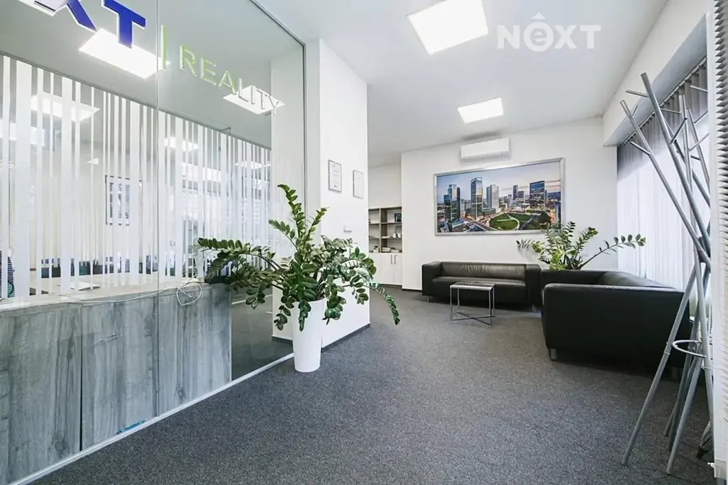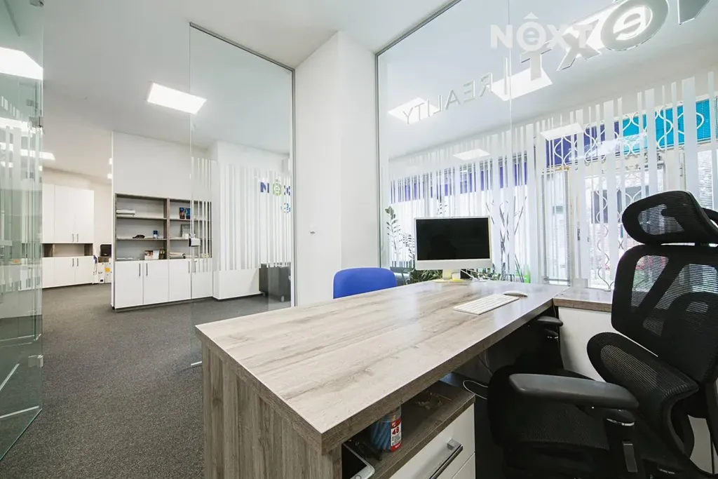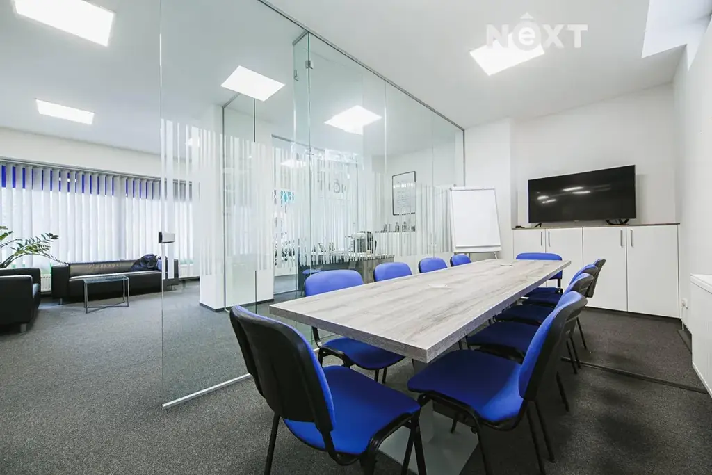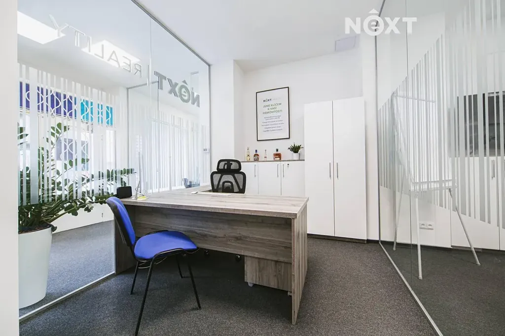 Moderní interiér je řešen v moderním open-space konceptu s elegantními skleněnými příčkami, které rozdělují prostor do funkčních zón, aniž by narušovaly pocit otevřenosti a světlosti. Skleněné příčky dodávají kanceláři profesionální, čistý a reprezentativní vzhled – přesně takový, jaký dnes moderní firmy vyžadují.