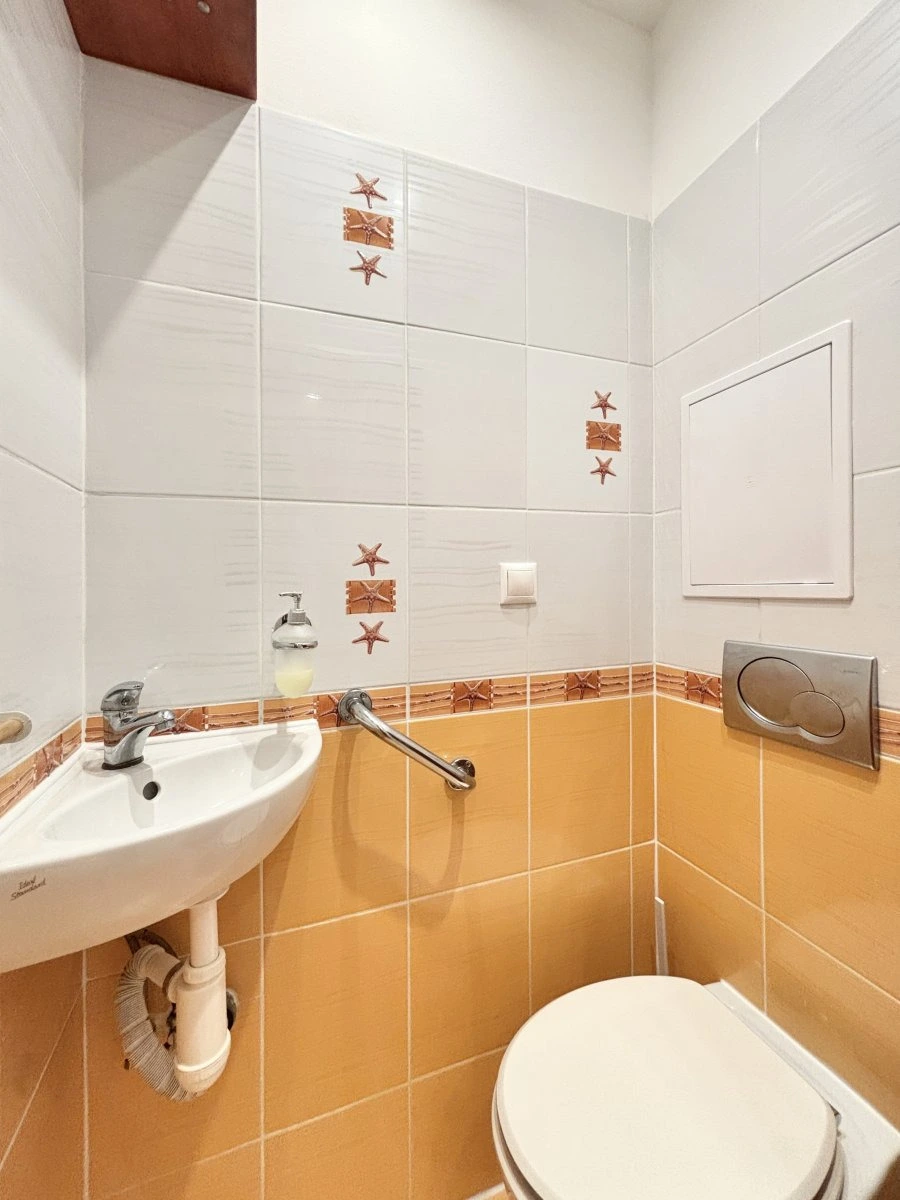 Byt se nabízí částečně vybavený. Kuchyně disponuje myčkou, elektrickou troubou, sporákem, mikrovlnnou troubou a digestoří. Obývací část je zařízena vestavěným nábytkem. Součástí ložnice je postel. Druhý pokoj je nezařízený. V koupelně je vana a umyvadlo. Toaleta je umístěna samostatně.