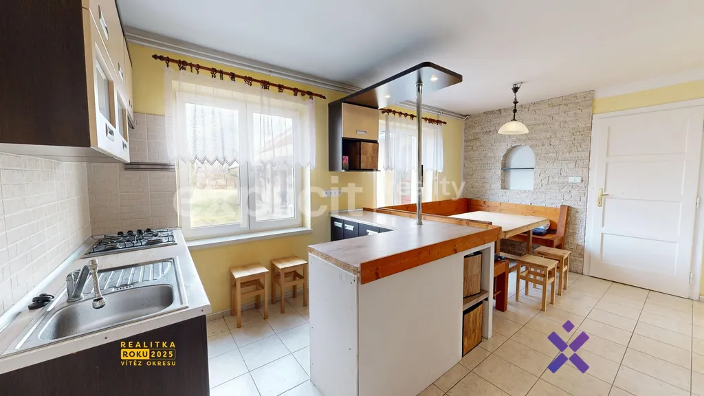 Kuchyně je vybavena kuchyňskou linkou se spotřebiči (myčka, sporák s troubou) a rustikálním jídelním koutem. Dominantou prostoru jsou funkční kachlová kamna, která dodávají domu příjemnou venkovskou atmosféru. Na kuchyni navazuje praktická komora s lednicí a suchým skladem potravin, a dále koupelna se sprchovým koutem. Z kuchyně se vstupuje do obývacího pokoje s TV stěnou, který je průchozí do hlavní ložnice vybavené šatní skříní a manželskou postelí. V druhé části domu se nachází další samostatný pokoj s vlastní koupelnou (s rohovou vanou) a komorou.