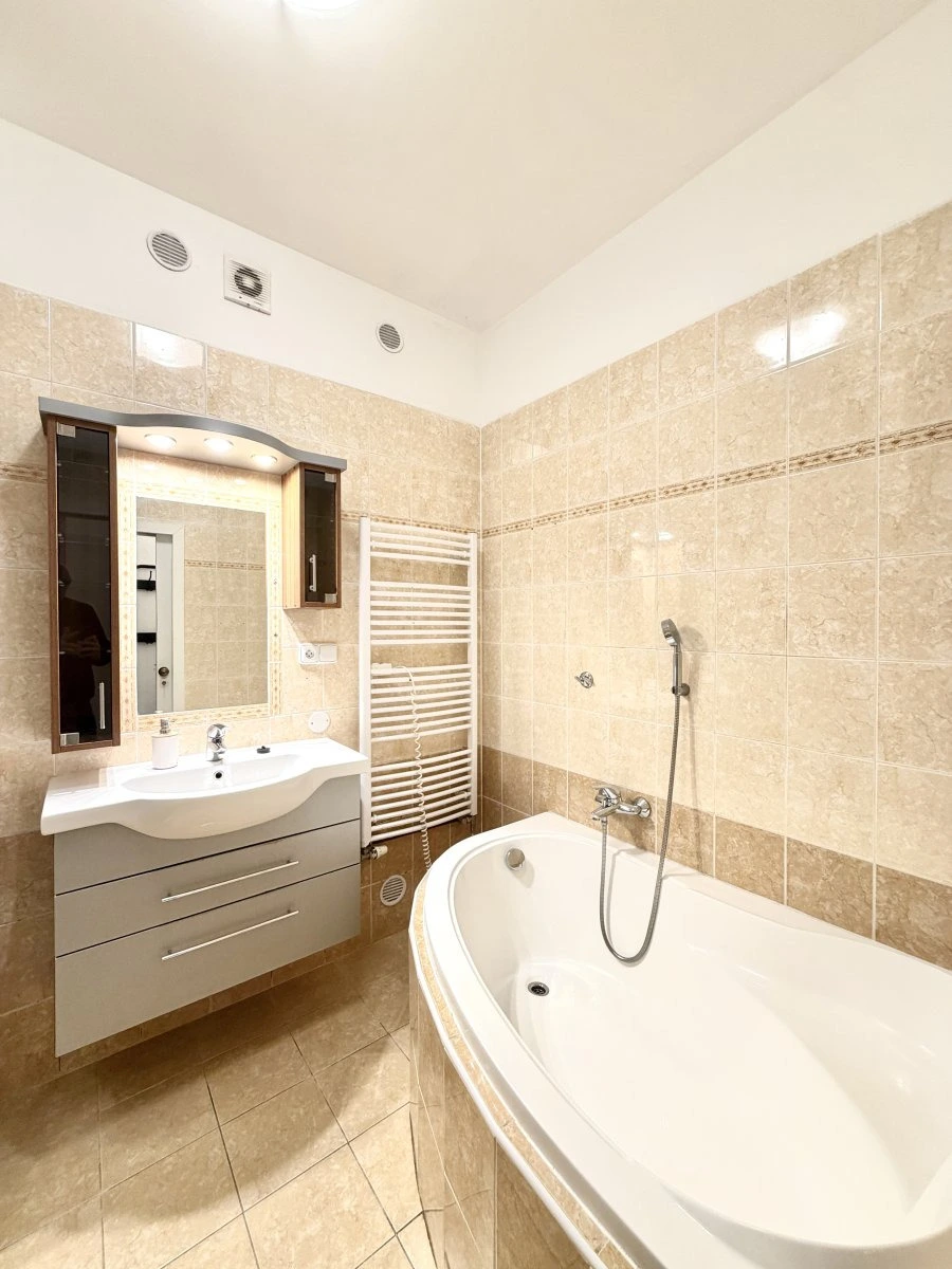 Byt se nabízí částečně vybavený. Kuchyně disponuje myčkou, elektrickou troubou, varnou deskou, mikrovlnnou troubou a digestoří. Obývací část a ložnice je bez vybavení. V druhém pokoji najdeme dvě šatní skříně. V koupelně je vana i sprchový kout, umyvadlo a pračka. Toaleta je umístěna samostatně. V bytě je také komora jako další úložný prostor.