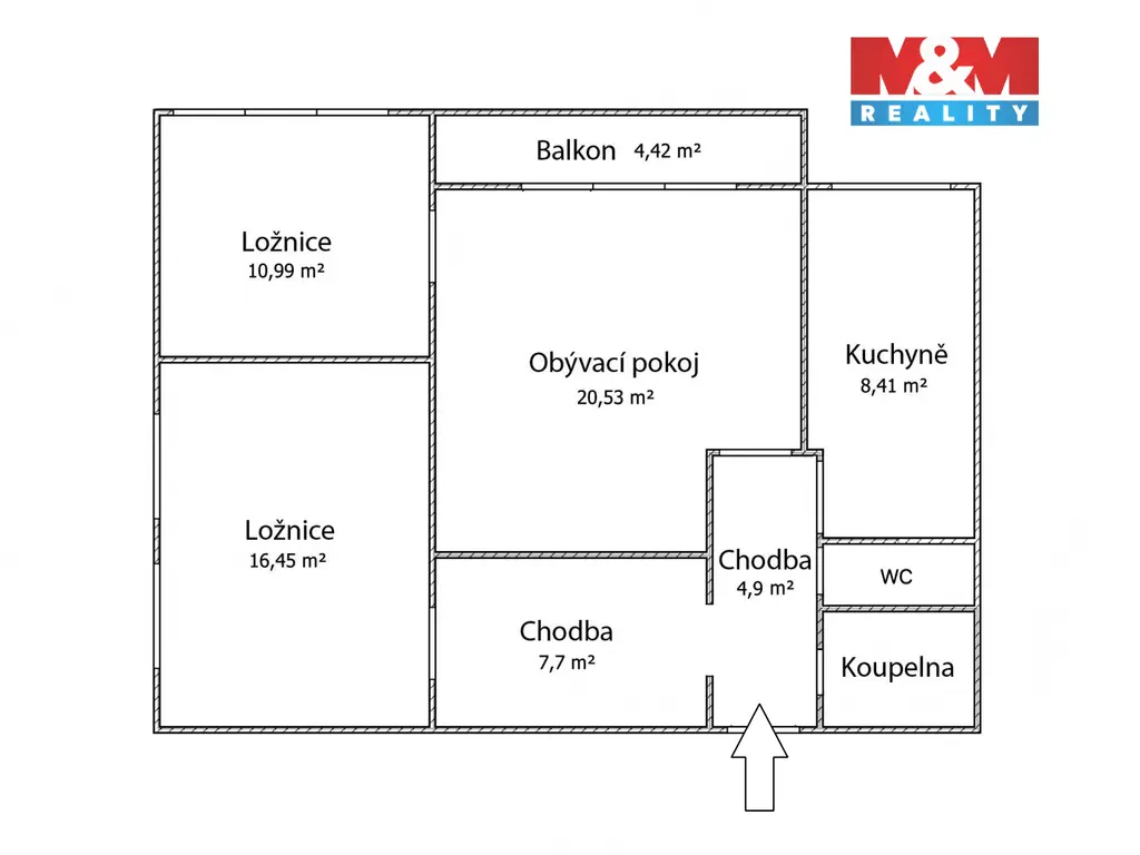 Dispozice bytu nabízí dostatek prostoru pro rodinné bydlení i variabilitu budoucích úprav. Prostorná vstupní chodba může sloužit jako pracovna či poskytne nadstandardní úložné možnosti. Kuchyni lze propojit s obývacím pokojem a vytvořit tak moderní otevřený obytný prostor dle současných trendů.