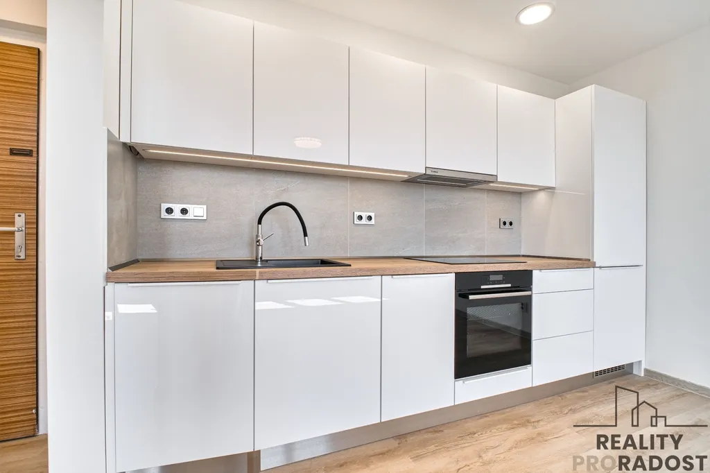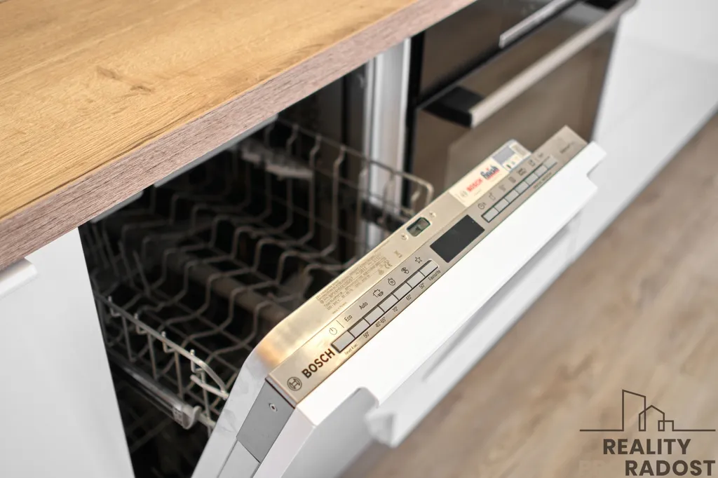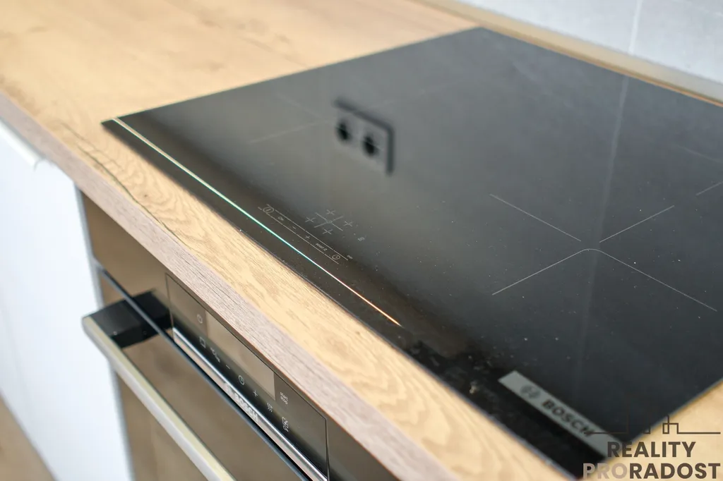 Kuchyňská linka vyrobená na míru kombinuje dekory lesklé bílé a dřevodekoru. Součástí kuchyňské linky jsou také vestavěné spotřebiče značky Bosch - lednice s mrazákem, trouba, indukční deska, myčka, odsavač par a také granitový dřez s odkapávačem. Kombinuje se zde systém otevírání pomocí úchytek a tip on systému. Pod horními skříňkami je LED osvětlení.