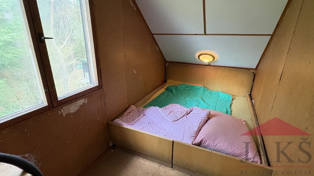 Popis: suterén: podsklepeno (sudy na vodu); přízemí: vstupní veranda, koupelna (sprcha a umyvadlo), sam. WC, obývací pokoj (kamna) s kuch. koutem (kuch. linka, lednice; plynový sporák s troubou na P.B., RV konvice, MV trouba, kávovar, el. boiler) a schodištěm do podkroví: velká ložnice se vstupem na balkon a ložnice.