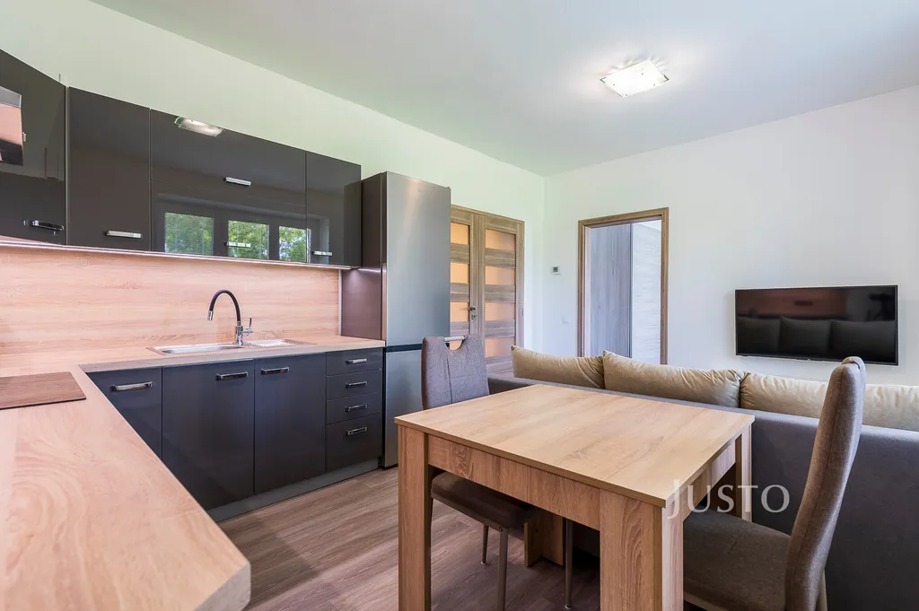 Kuchyně: Kuchyňská linka s vestavěnými elektrospotřebiči značky Gorenje (indukční varná deska, elektrická trouba a digestoř), mikrovlnná trouba značky Beko a lednice s mrazákem značky Gorenje. V kuchyni je také jídelní stůl, dvě židle, sedací souprava, konferenční stolek, stolek pod televizí a televize JVC.