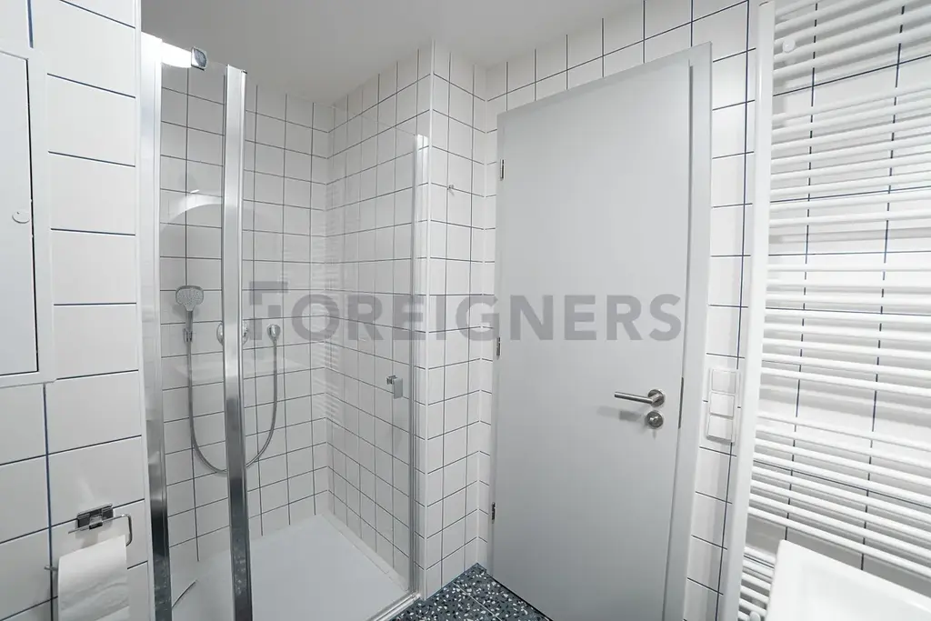 Koupelna je vybavena umyvadlem, zrcadlem, WC, sprchovým koutem, úložným boxem, ventilátorem a topným žebříkem.