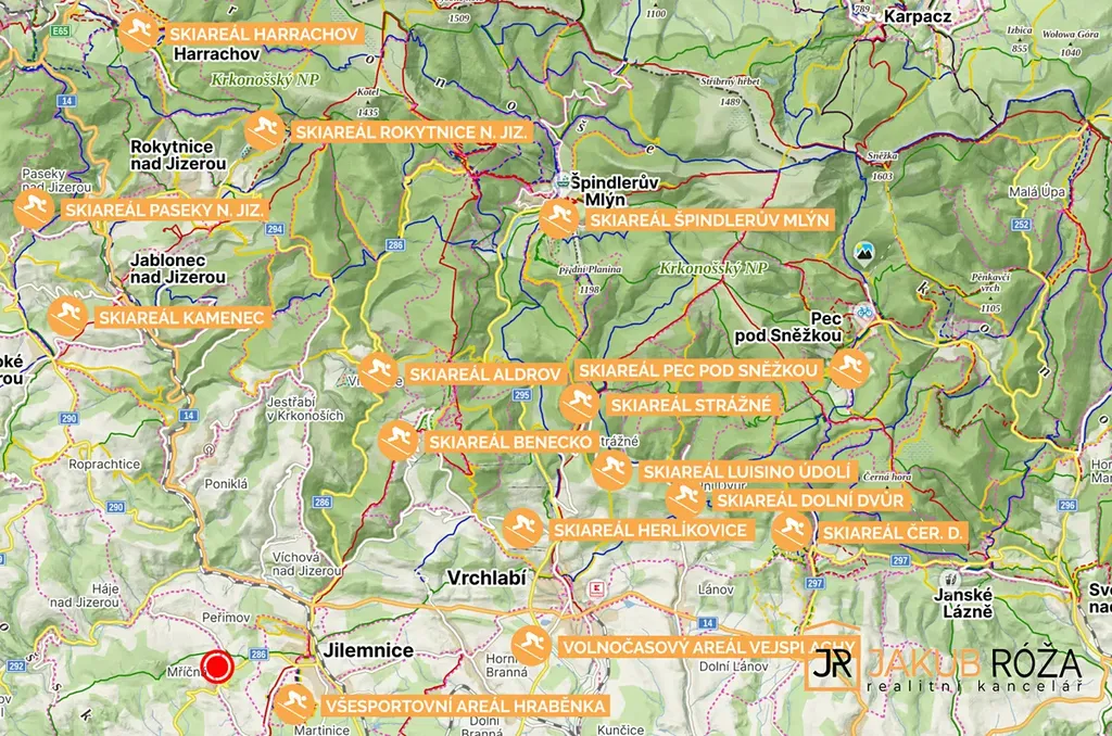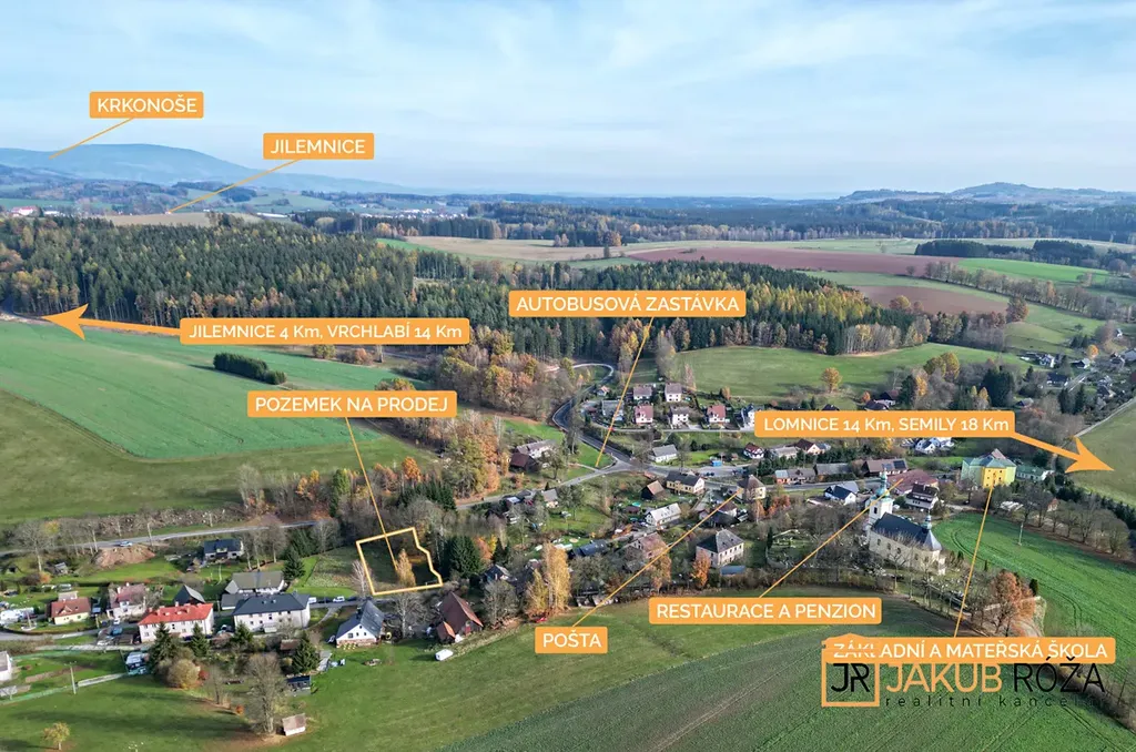 Z pozemku je to 3,5 Km do Jilemnice, 14 Km do Vrchlabí, 15 Km do Lomnice nad Popelkou, 16 Km do Nové Paky, 18 Km do Semil.