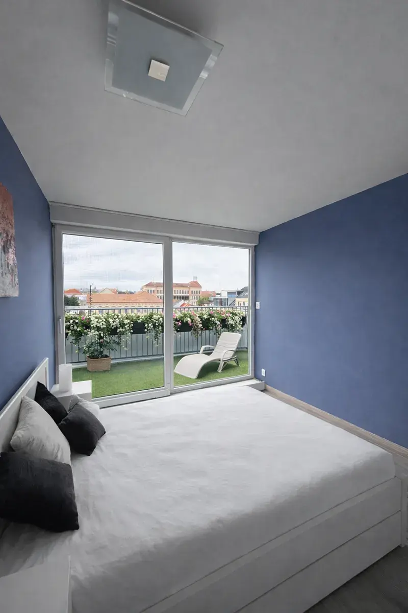 Velkou výhodou je přímý vstup na terasu jak z obývacího pokoje, tak i z ložnice, což dodává bytu vzdušnost a příjemné propojení interiéru s venkovním prostorem.