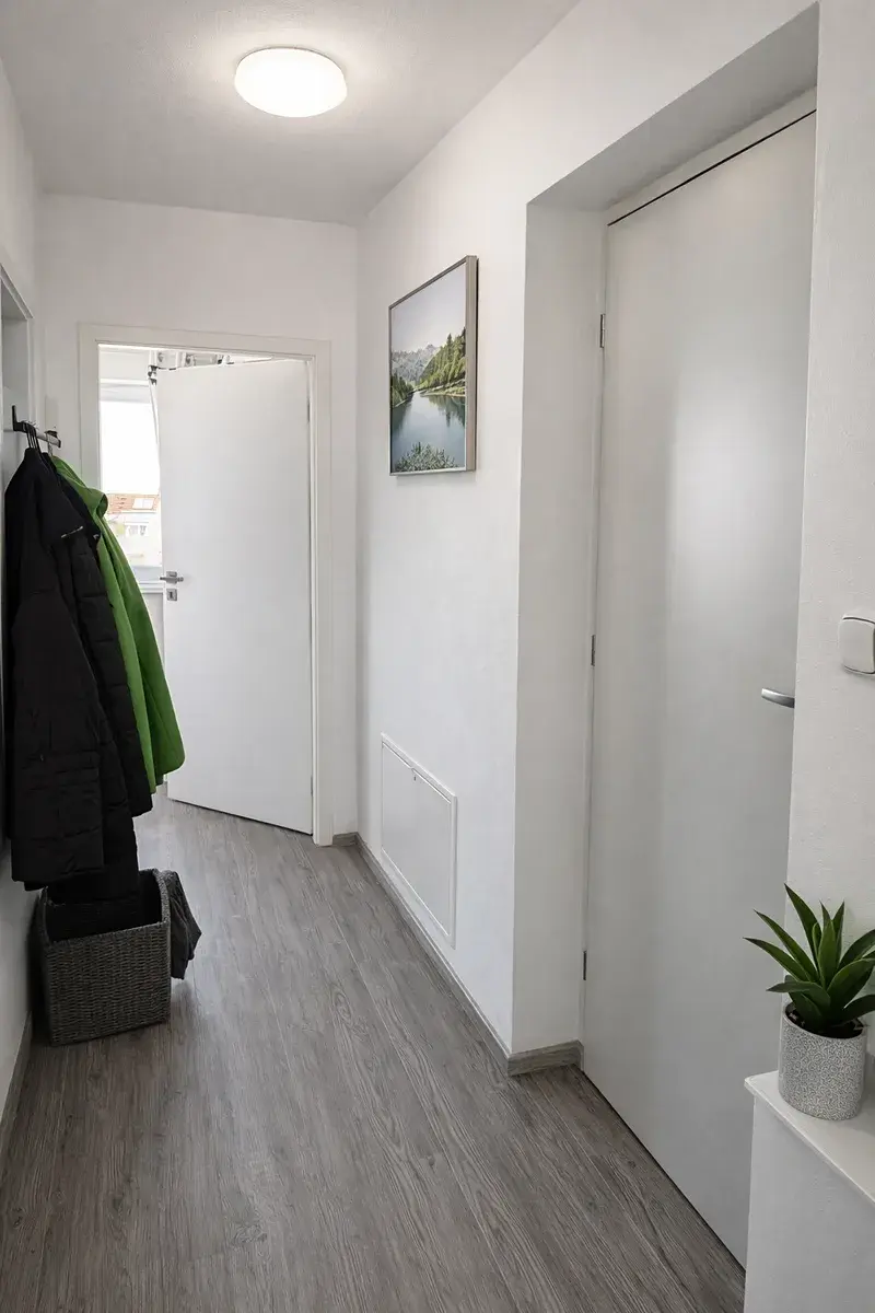 Dispozice bytu je velmi praktická – obývací pokoj s kuchyňským koutem tvoří hlavní obytný prostor, ložnice je doplněna o samostatnou šatnu, která výrazně zvyšuje komfort bydlení a nabízí dostatek úložného prostoru.