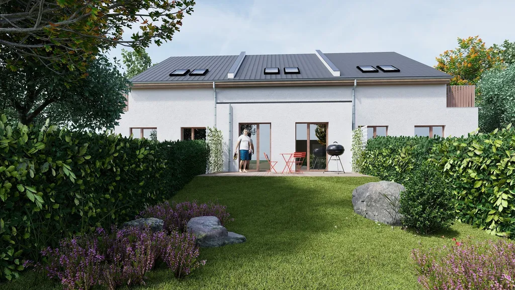 Řadové domy jsou navrženy v jednotném architektonickém stylu s jednoduchým obdélníkovým půdorysem a sedlovou střechou. Každá bytová jednotka je doplněna o jednopodlažní výstupek (např. obývací pokoj s kuchyňským koutem), nad kterým je navržena pultová střecha. Tento prvek dodává domům moderní a zároveň funkční vzhled.