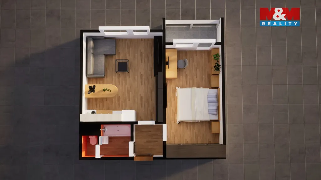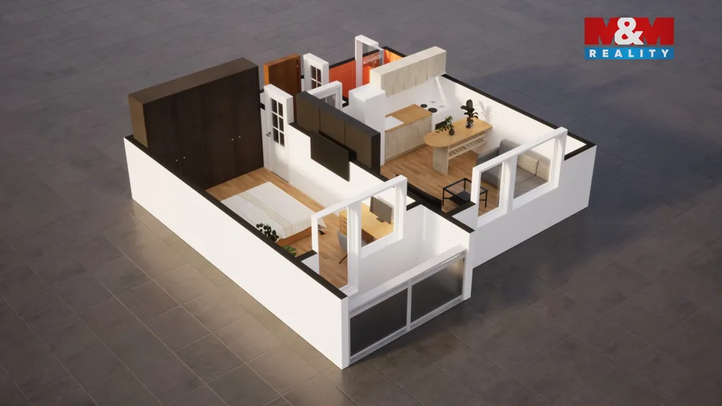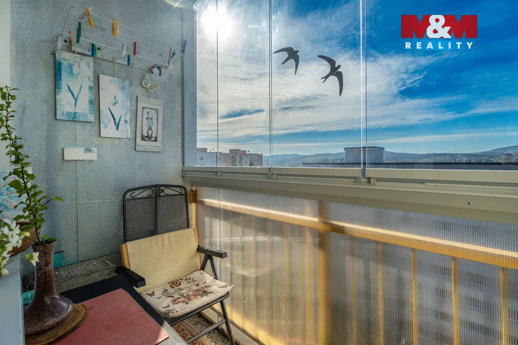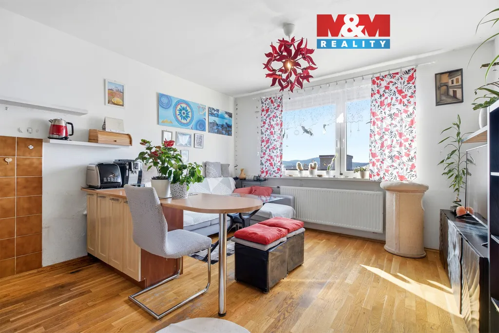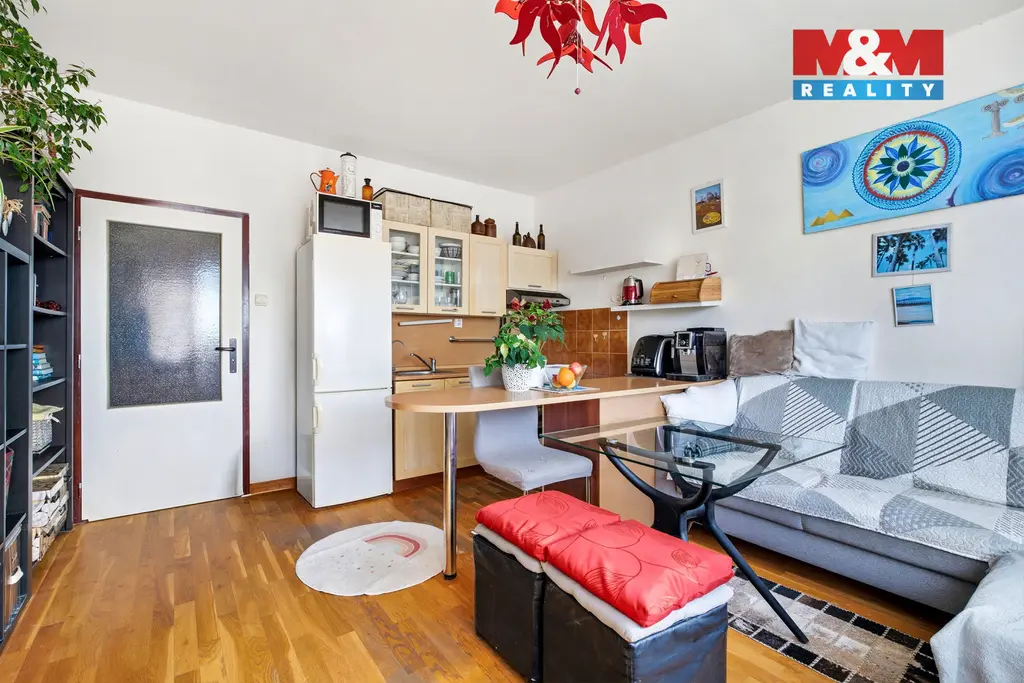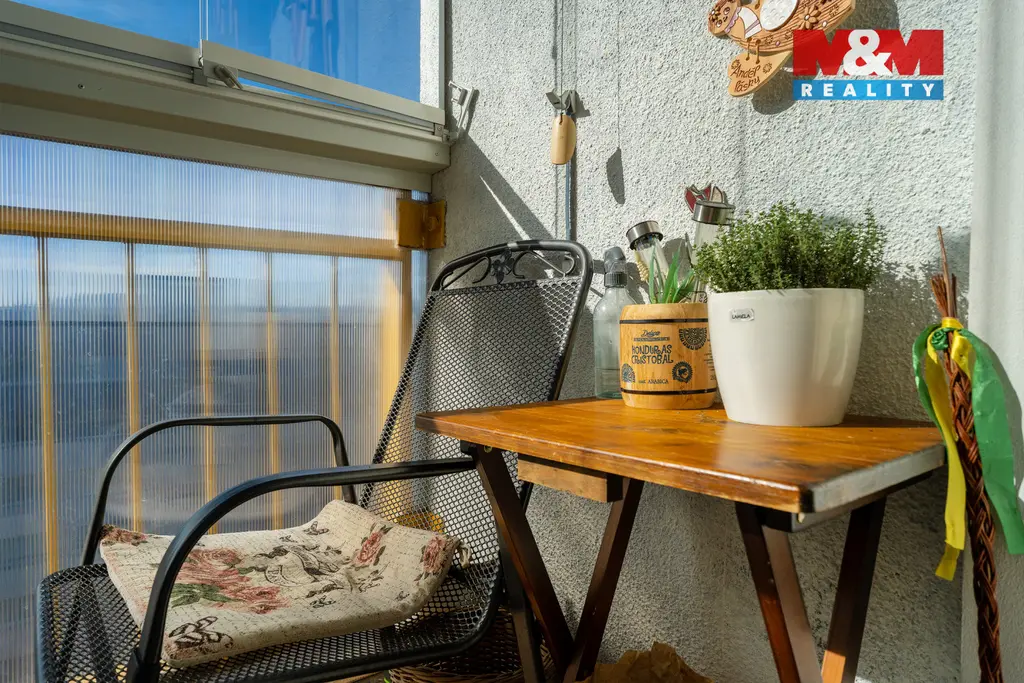 Dispozice bytu je prakticky řešená – tvoří ji obývací pokoj s kuchyňským koutem, samostatná ložnice, koupelna s toaletou a menší předsíň. Příjemným benefitem je také balkon, ideální pro relaxaci s výhledem do okolí. Byt působí světlým a vzdušným dojmem.