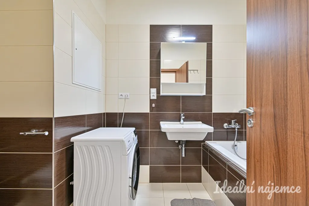 V koupelně se nachází vana, umyvadlo s úložnou skříňkou, zrcadlo, toaleta a pračka.