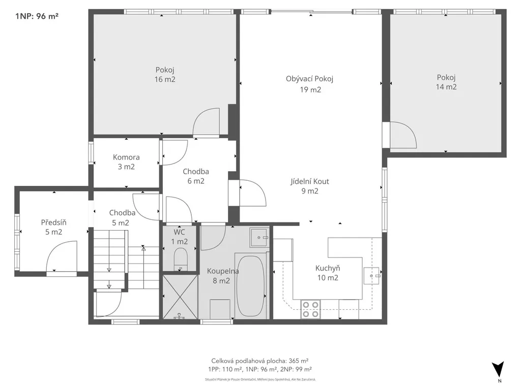Celková plocha 365 m2 vzniká součtem jednotlivých podlaží domu a vedlejší stavby. První podzemní podlaží nabízí cca 110 m2, první nadzemní podlaží cca 96 m2 a druhé nadzemní podlaží cca 99 m2. Součástí je také vedlejší stavba zapsaná v katastru nemovitostí o výměře cca 60 m2. Přehled jednotlivých podlaží včetně jejich výměr naleznete v půdorysech ve fotogalerii.