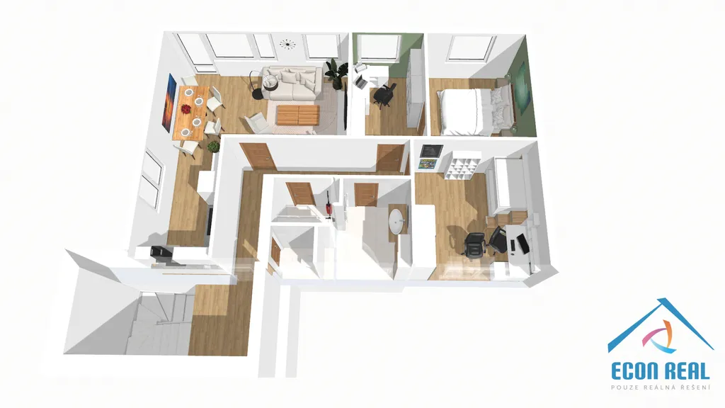 Horní podlaží je koncipováno jako čistě obytné a nabízí samostatnou toaletu, obývací pokoj s balkonem a zajímavým výstupem na zahradu po točitém schodišti, koupelnu s vanou, velkou úklidovou komoru a tři pokoje.